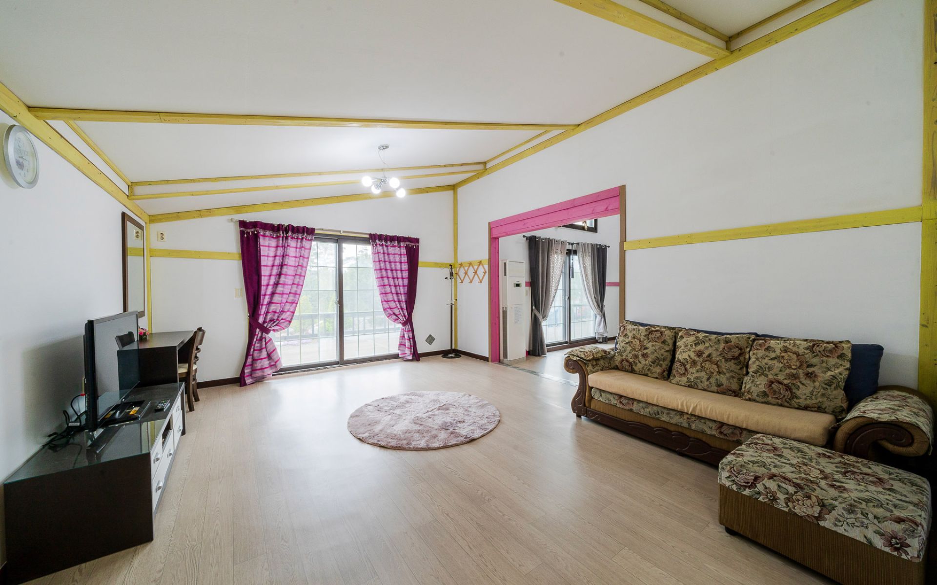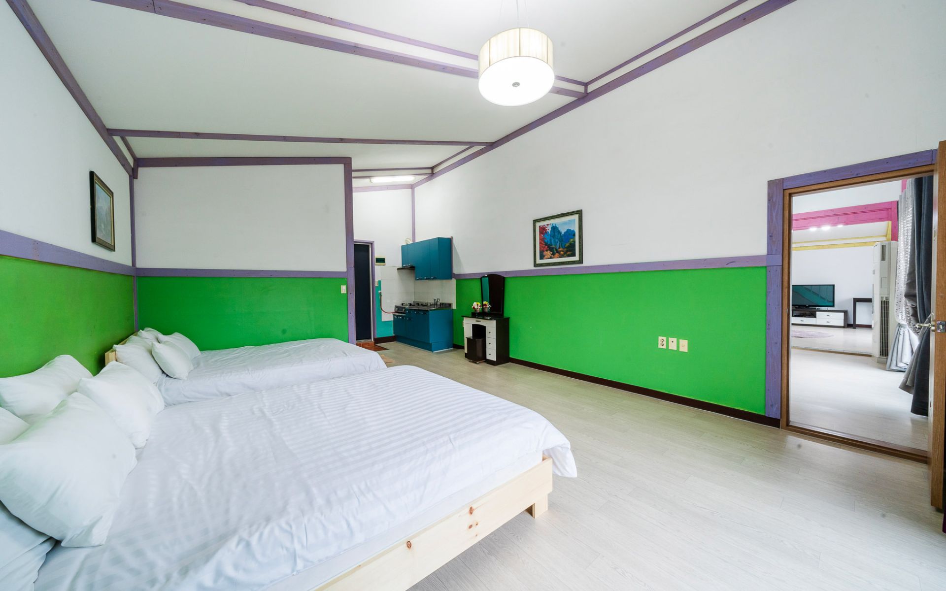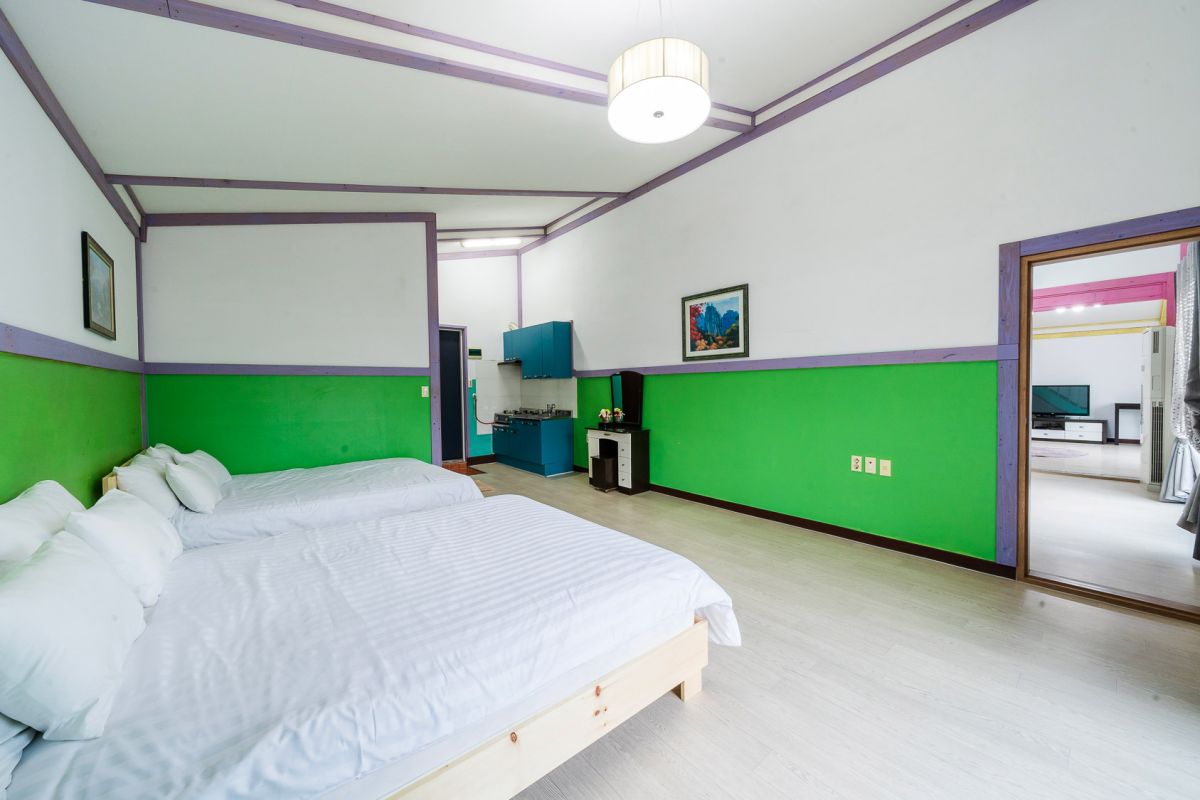• 시설 : TV,침대,식탁,에어컨,냉장고,가스렌지,전자렌지,드라이기,취사,전기밥솥,욕실용품