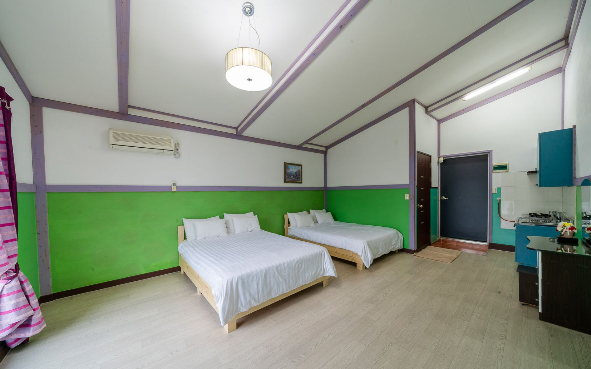 방1(침대2개), 복층(침대2),거실,주방,화장실 3개, 복층구조 에어컨 2대