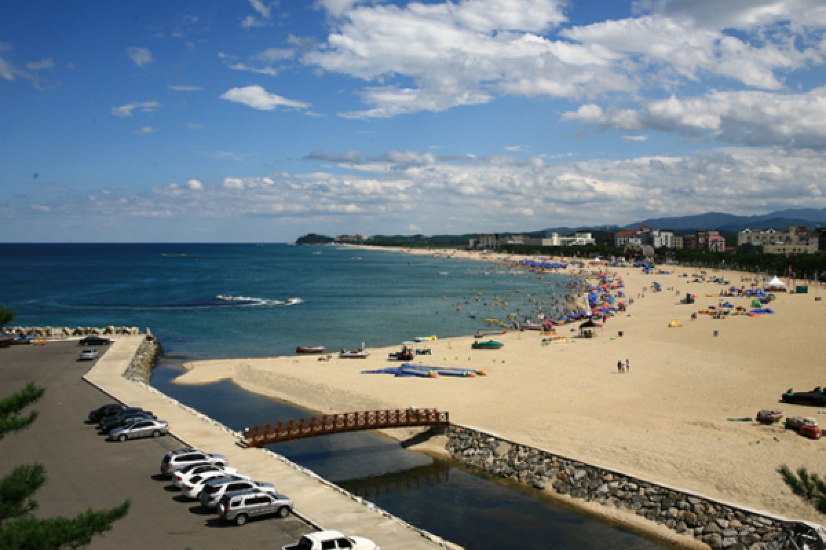 이곳은 울창한 소나무숲을 배경으로 4km의 백사장이 펼쳐져 있고, 설악산에서 흘러내리는 남대천 이 하구에 큰 호수를 이루고 있어 담수도 풍부하다. 수심은 70m 앞바다까지 1.5m 내외이므로 안전하여 1963년 해수욕장으로 개장한 이래 성황을 이루고 있다.